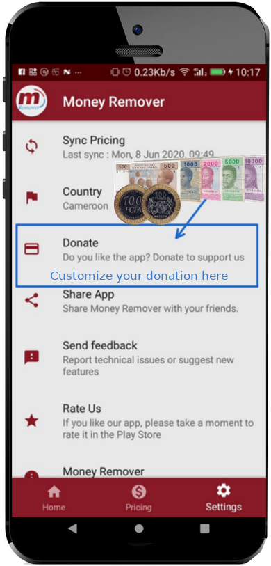 You are about to make a donation of 1000 XAF to support the efforts of the Money Remover application development team